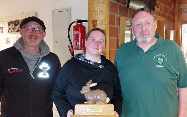 Gesamtsiegerin Nadine Evers (Mitte) erhielt aus den Händen von Organisationsleiter Stefan Mönnich (rechts) und Stellv. Schießsportleiter Jens Mönnich (links) den „Wanderosterhasen“ überreicht.