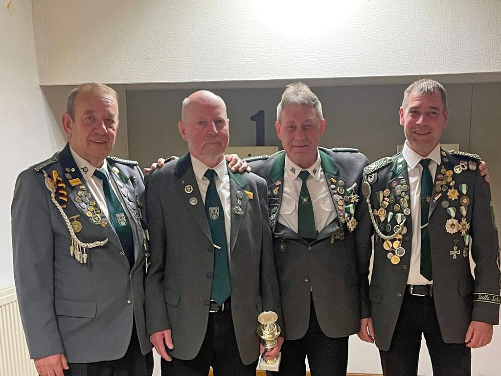 Den Ferienwanderpokal konnte sich in diesem Jahr Jochen Müller (2. v.l.) vor Michael Nehrenberg (li.) und Hans-Jürgen Frühauf (2. v.r.) sichern. Auf der Mitgliederversammlung am 26.09.2025 überreichte der stellvertretende Schießsportleiter Lars Schwerdtfeger (re.) den Pokal an Jochen.