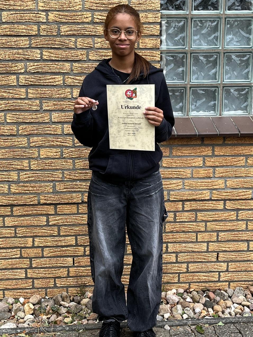 Jenna Struck präsentiert die gewonnene Urkunde.