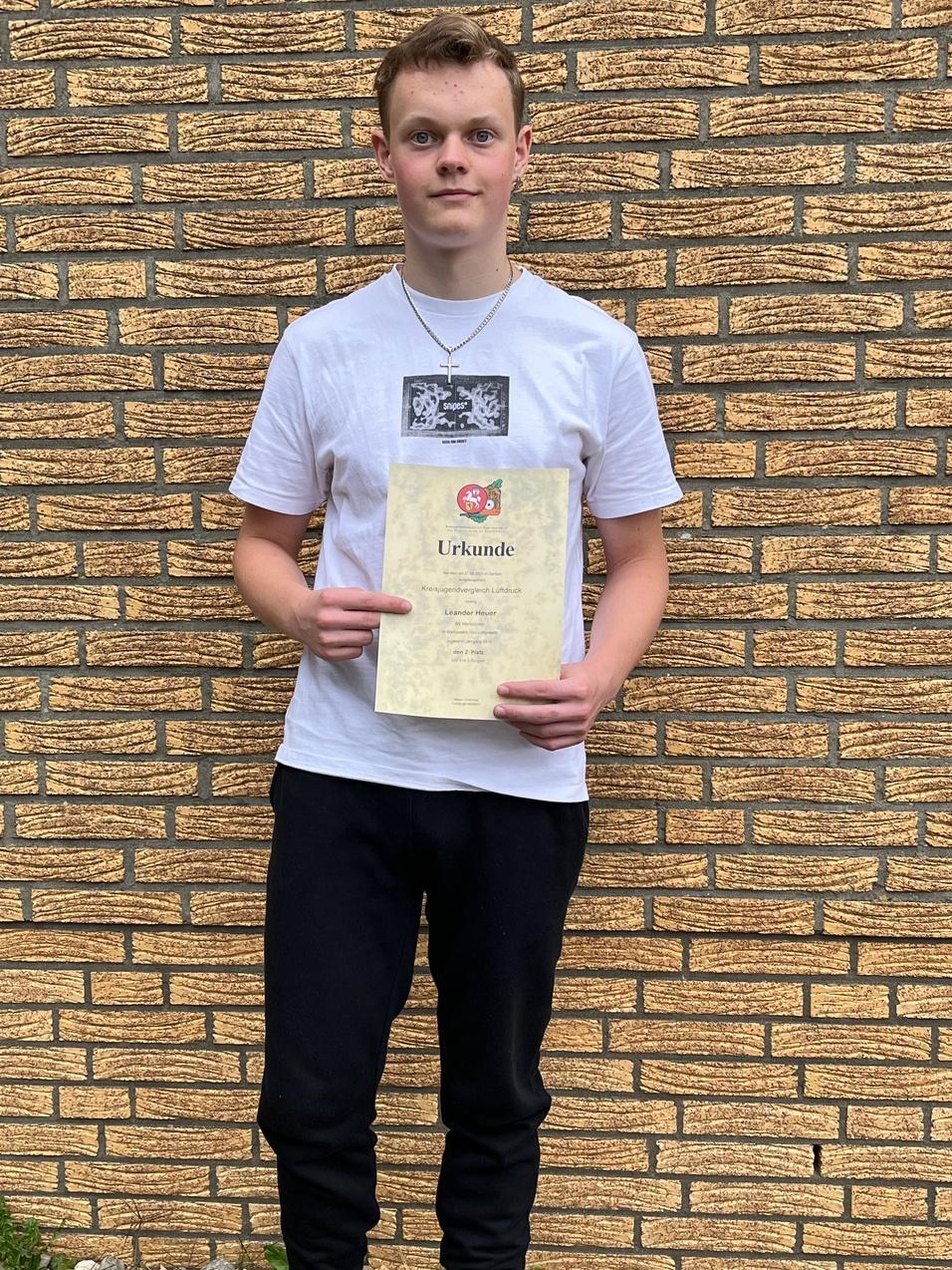 Leander Heuer mit der überreichten Urkunde beim Vergleichsschiessen.