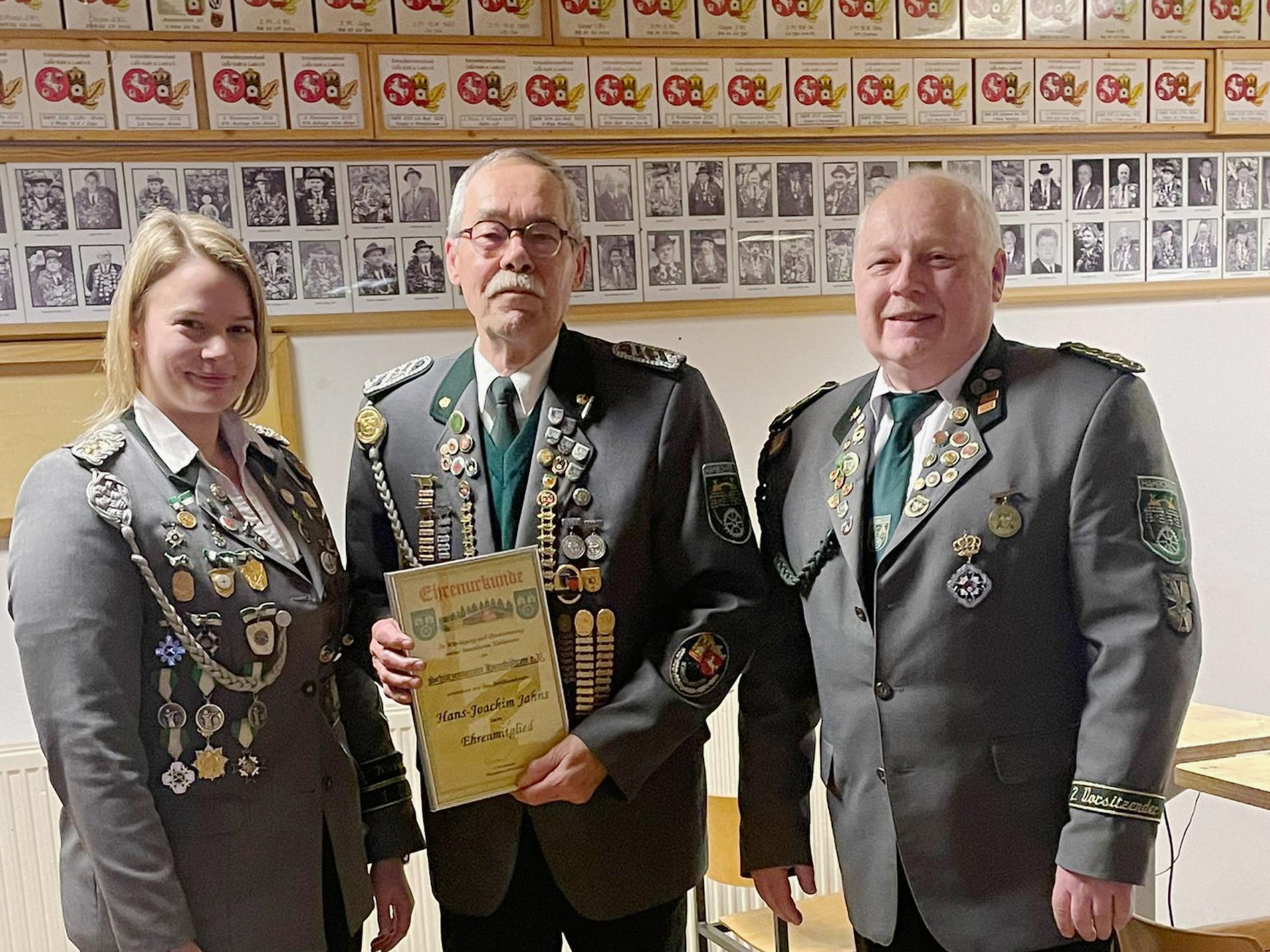 Als neue Kassenprüfer wurden Lena Gerke und Jan-Christian Gerke gewählt. Durch ein insgesamt besseres finanzielles Ergebnis im zurückliegenden Vereinsjahr als im Jahr zuvor sah 1. Kassierer Jörg Herrmann-Rauls für eine Änderung der Mitgliedsbeiträge keine Veranlassung. Hans-Joachim Jahns, vereinsintern als „Achim“ bekannt, wurde für seine langjährige engagierte Mitgliedschaft zum neuen Ehrenmitglied des Vereins ernannt. Nach dem Eintritt in den Verein 1984 war er 1989 als Schriftführer, 1991 als stellvertretender Schießsportleiter, 1992 als kommissarischer Jugendleiter und 1995 als Schießsportleiter aktiv.